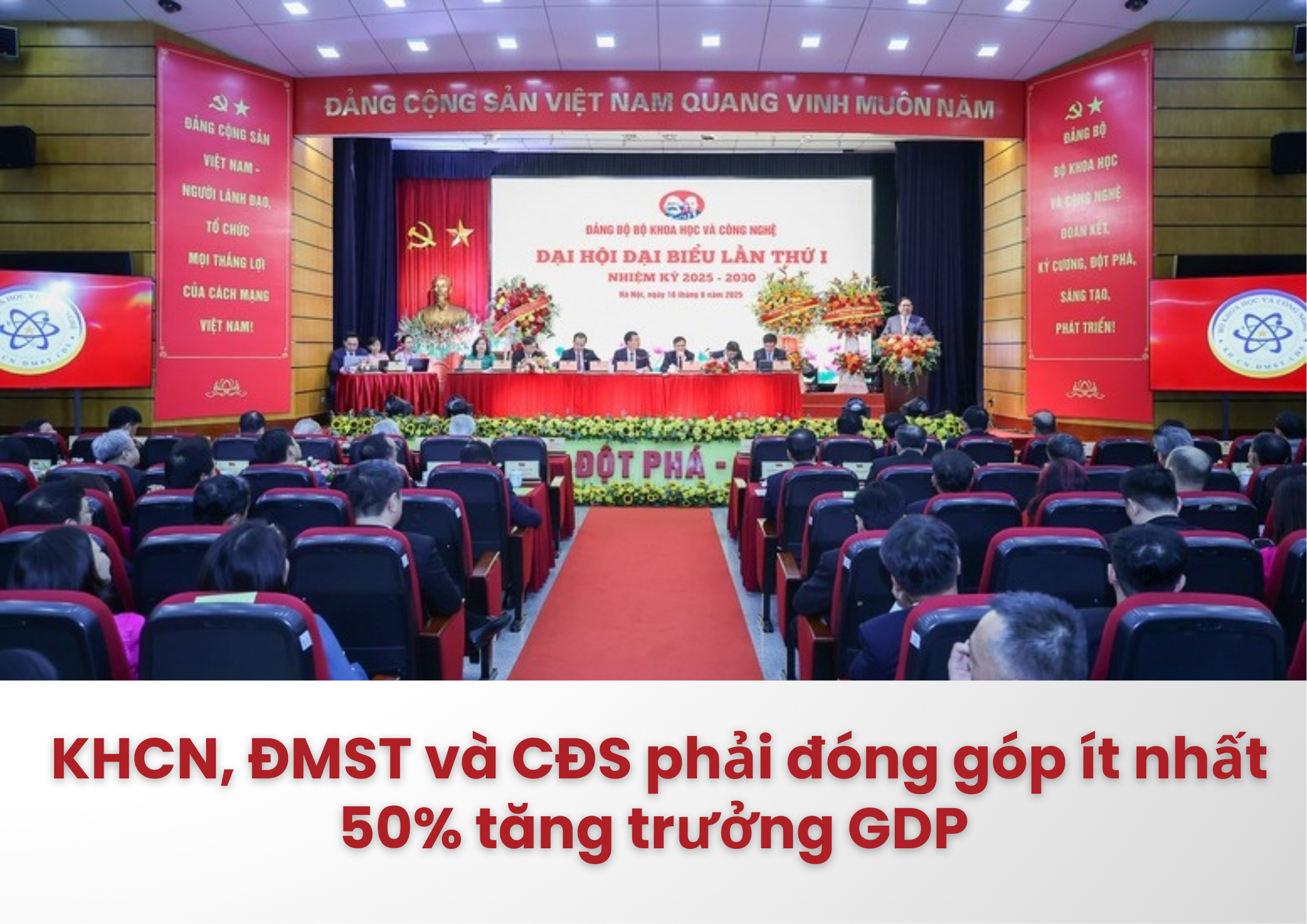 Ngày 16/8, tại Hà Nội, Đảng bộ Bộ Khoa học và Công nghệ tổ chức Đại hội Đại biểu lần thứ I, nhiệm kỳ 2025-2030. Tại Đại hội, Bộ trưởng Bộ Khoa học và Công nghệ Nguyễn Mạnh Hùng nêu rõ khoa học, công nghệ, đổi mới sáng tạo và chuyển đổi số phải hướng tới mục tiêu nâng cao năng lực cạnh tranh quốc gia, năng suất lao động, năng lực quản trị quốc gia, thúc đẩy tăng trưởng kinh tế, bảo đảm an ninh quốc phòng, nâng cao chất lượng cuộc sống của nhân dân; trong đó yêu cầu các lĩnh vực này phải đóng góp ít nhất 50% tăng trưởng GDP và tập trung giải quyết các bài toán chiến lược quốc gia, như thúc đẩy tăng trưởng hai con số.